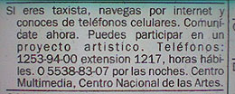 Esta superposición de redes tecnológicas, la red del sistema de taxis de sitio (radio-taxis), la red de los teléfonos celulares y por último, la red Internet, se complementan con una red de comunicación más compleja compuesta por las historias que se tejen y destejen en los auto-móviles de alquiler que atraviesan constantemente el DF.